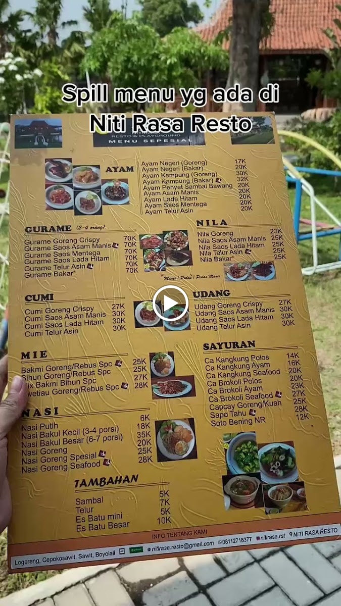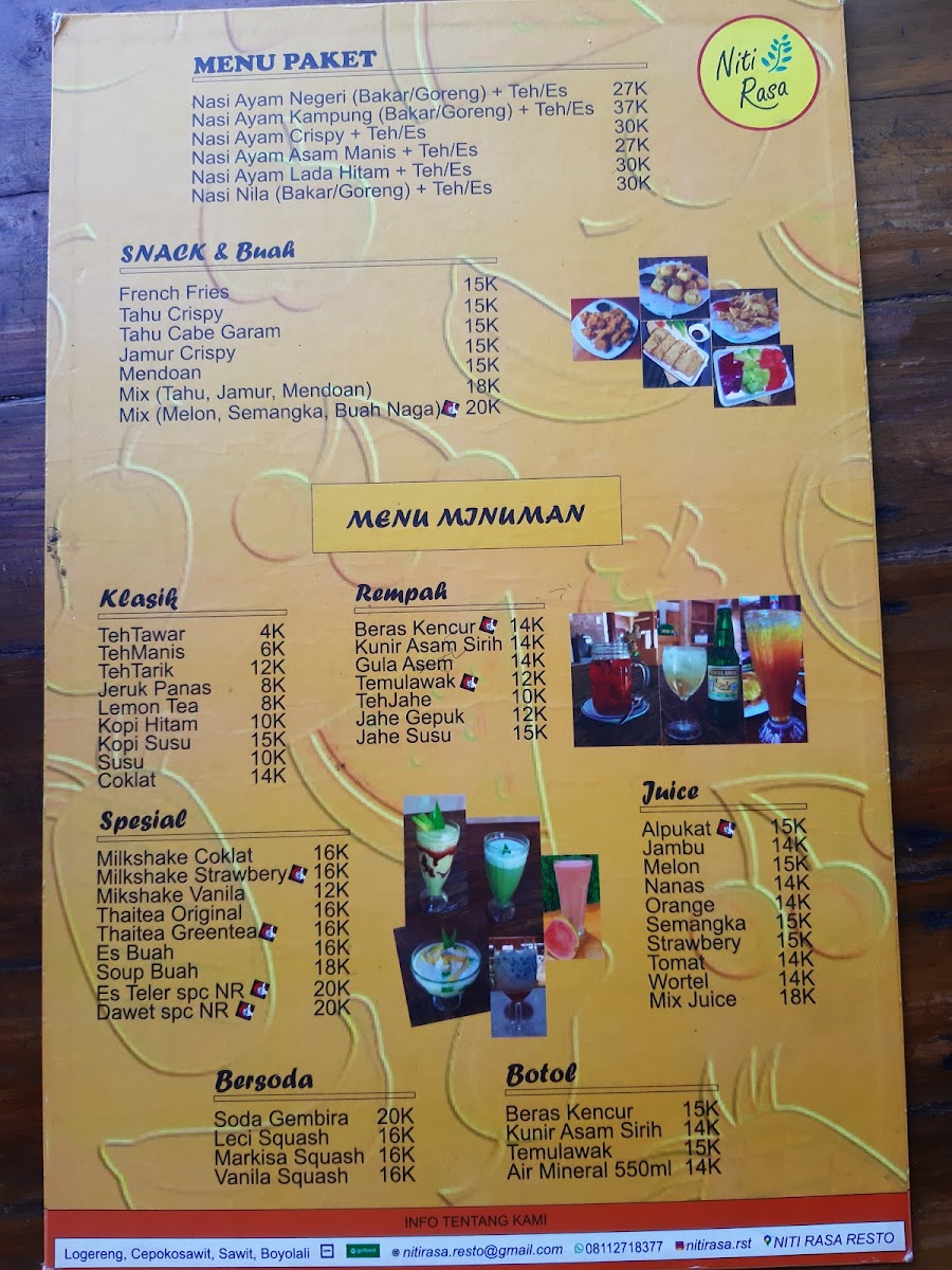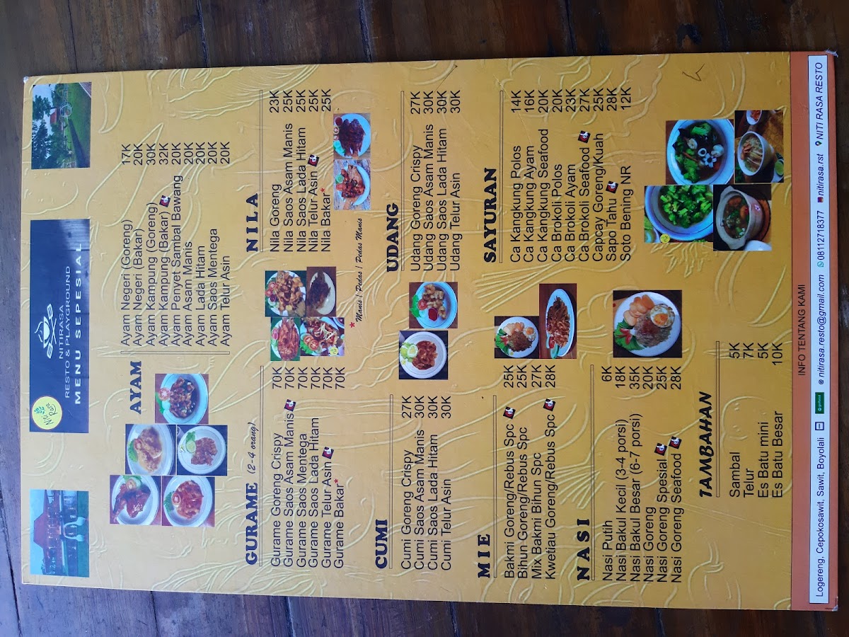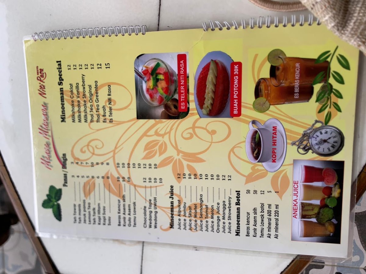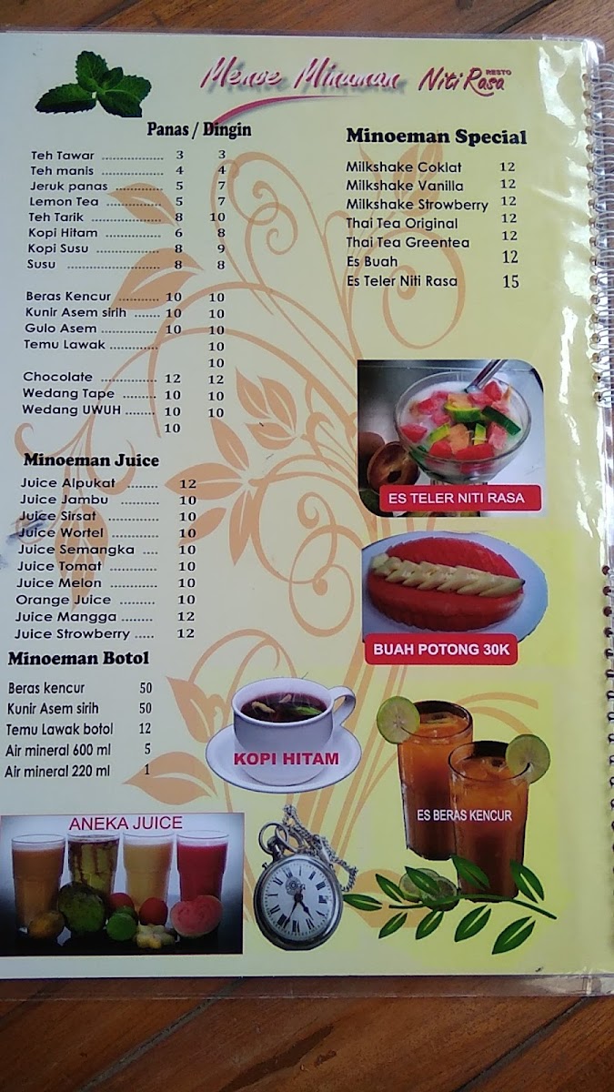 Welcome to the Niti Rasa Resto Menu, where you'll find a delightful mix of traditional flavors and innovative dishes. Located in the heart of Dukuh Logereng, Cepokosawit, Sawit, Boyolali Regency, Central Java, this place brings the authentic tastes of Indonesia to your table with a warm, welcoming atmosphere. Whether you’re craving a savory dish or something sweet, there’s something for everyone here. The menu highlights locally sourced ingredients, bursting with freshness and flavor, offering a variety of Indonesian favorites and modern twists. Each dish is carefully prepared to create a memorable dining experience. Whether you're here for a quick bite or a leisurely meal with family and friends, the options are as exciting as they are satisfying. Come hungry and ready to explore all that this menu has to offer, and let the vibrant tastes of Niti Rasa Resto take you on a journey of Indonesian culinary excellence.